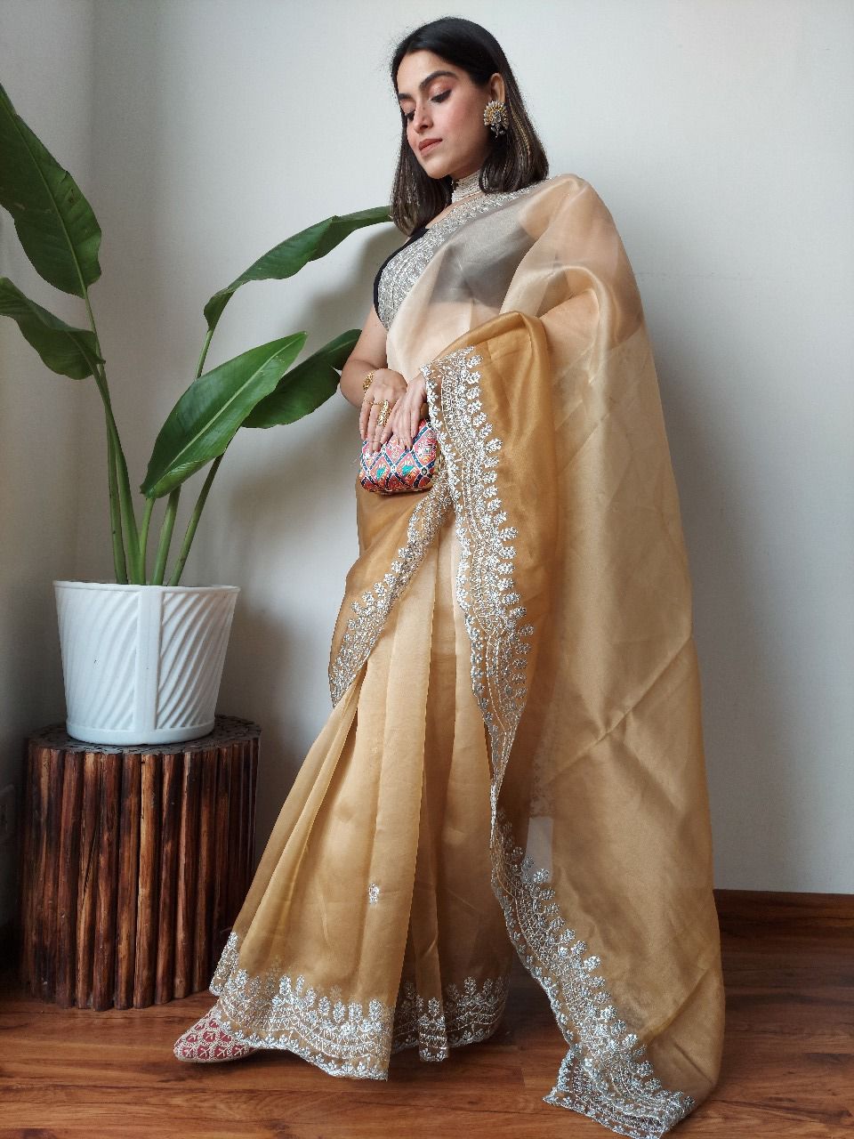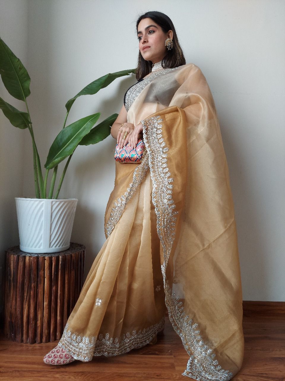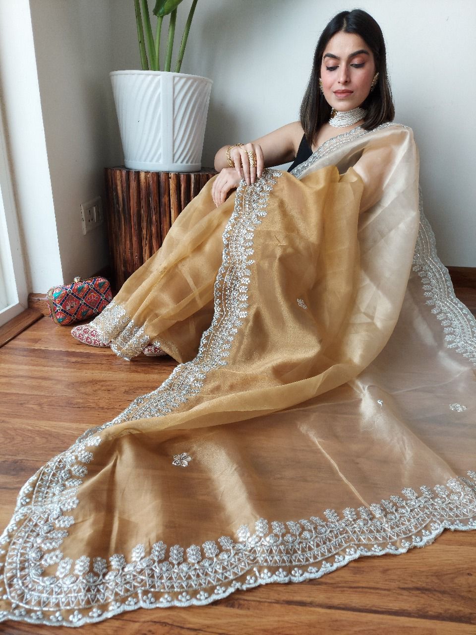 Designed with splendid zari abstract organza saree are the epitome of vibrant royal style. This glorious piece comes in tints of zari with artists work done in embroidery sequence work on prominent borders. Choose this and take home a proud story of culture and contemporary charm.