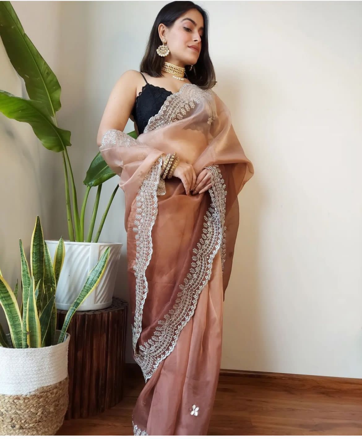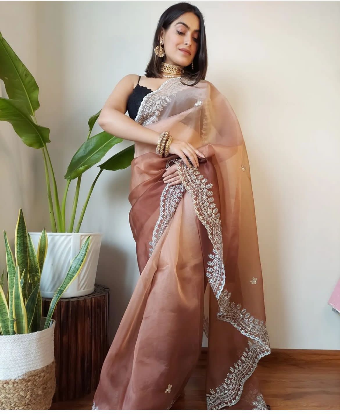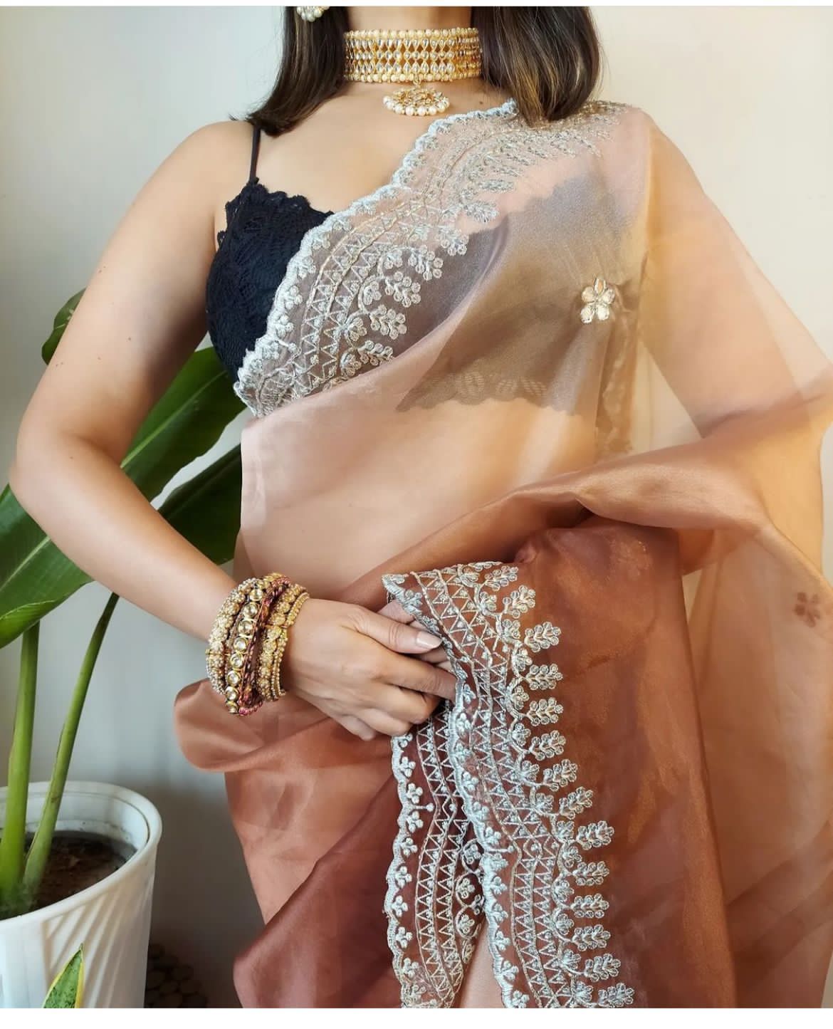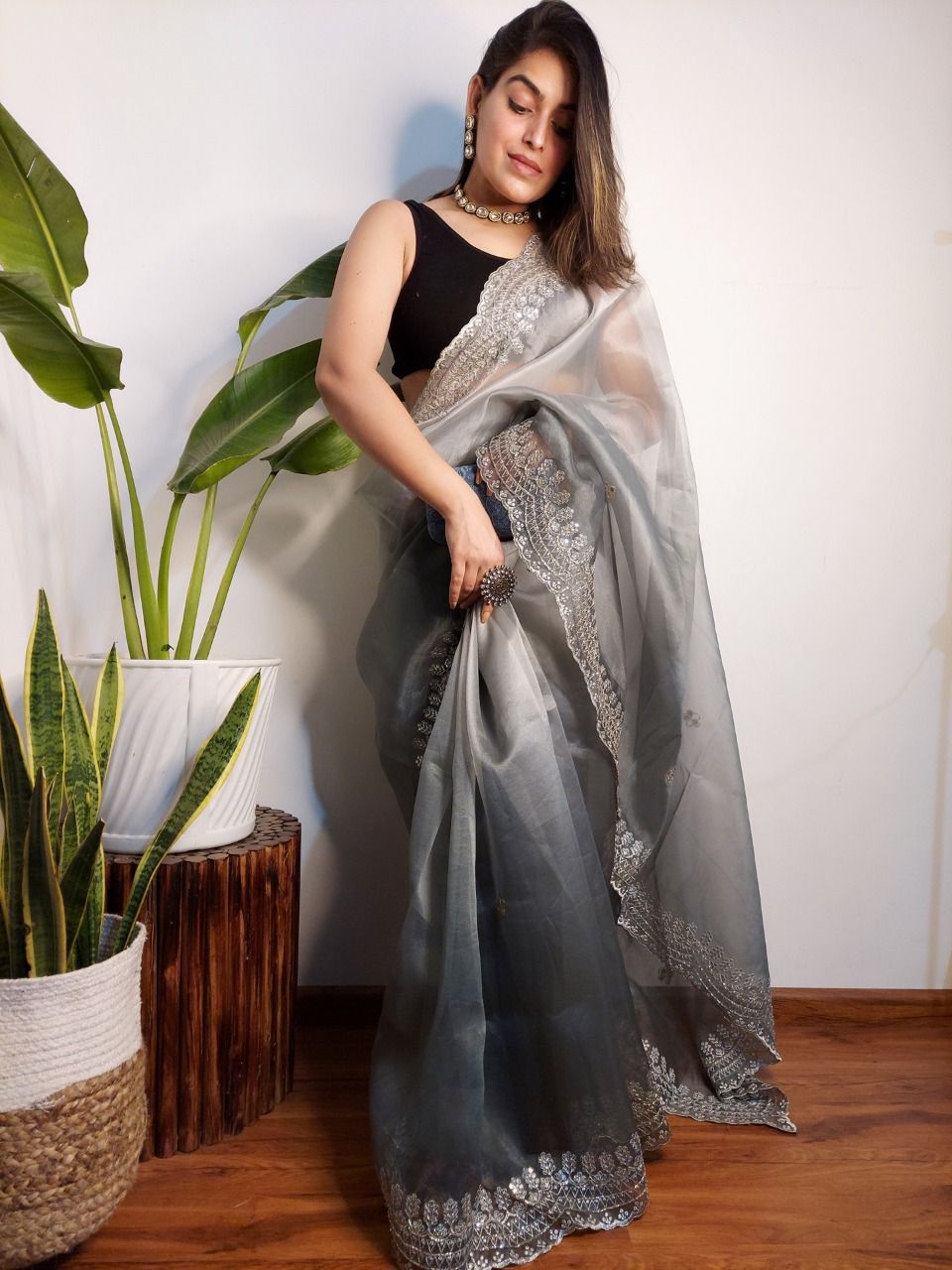 Designed with splendid zari abstract organza saree are the epitome of vibrant royal style. This glorious piece comes in tints of zari with artists work done in embroidery sequence work on prominent borders. Choose this and take home a proud story of culture and contemporary charm.