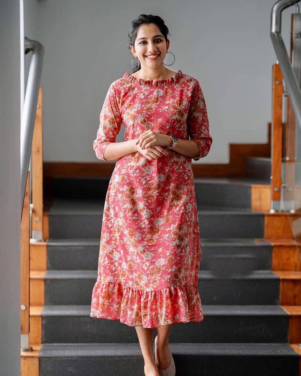 A-Line Floral Midi Dress In Georgette Material , Has Platted Neck With Three By Fourth Sleeves. Flare Attached To The Bottom. Lining Attached.