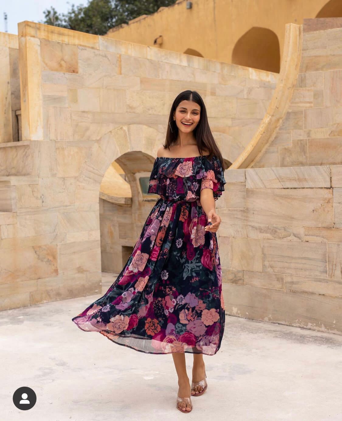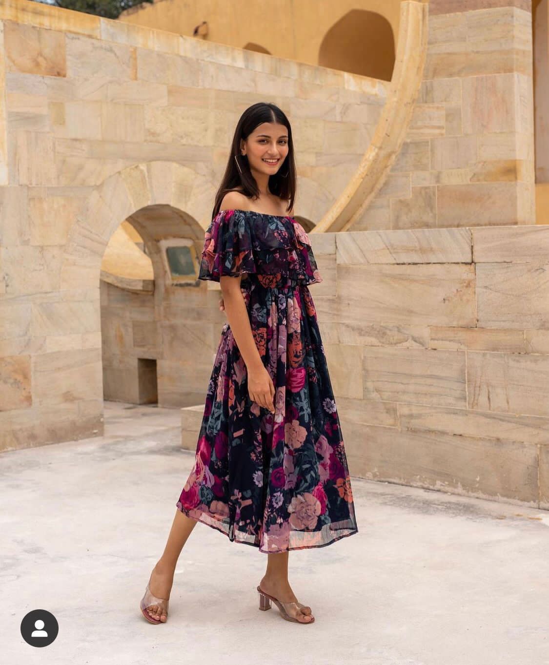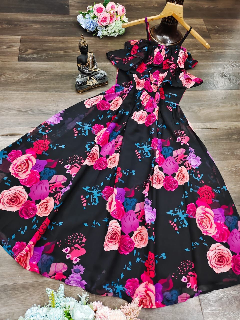 Incorporate minimalistic styles into your ethnic yet modern line-up with this elegant maxy. With the eternally soothing shades of flower design, this ensemble is as comfortable as its chic. Pair it with your favorite heels and win all the limelight.