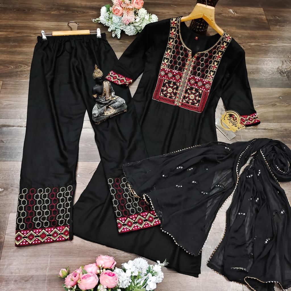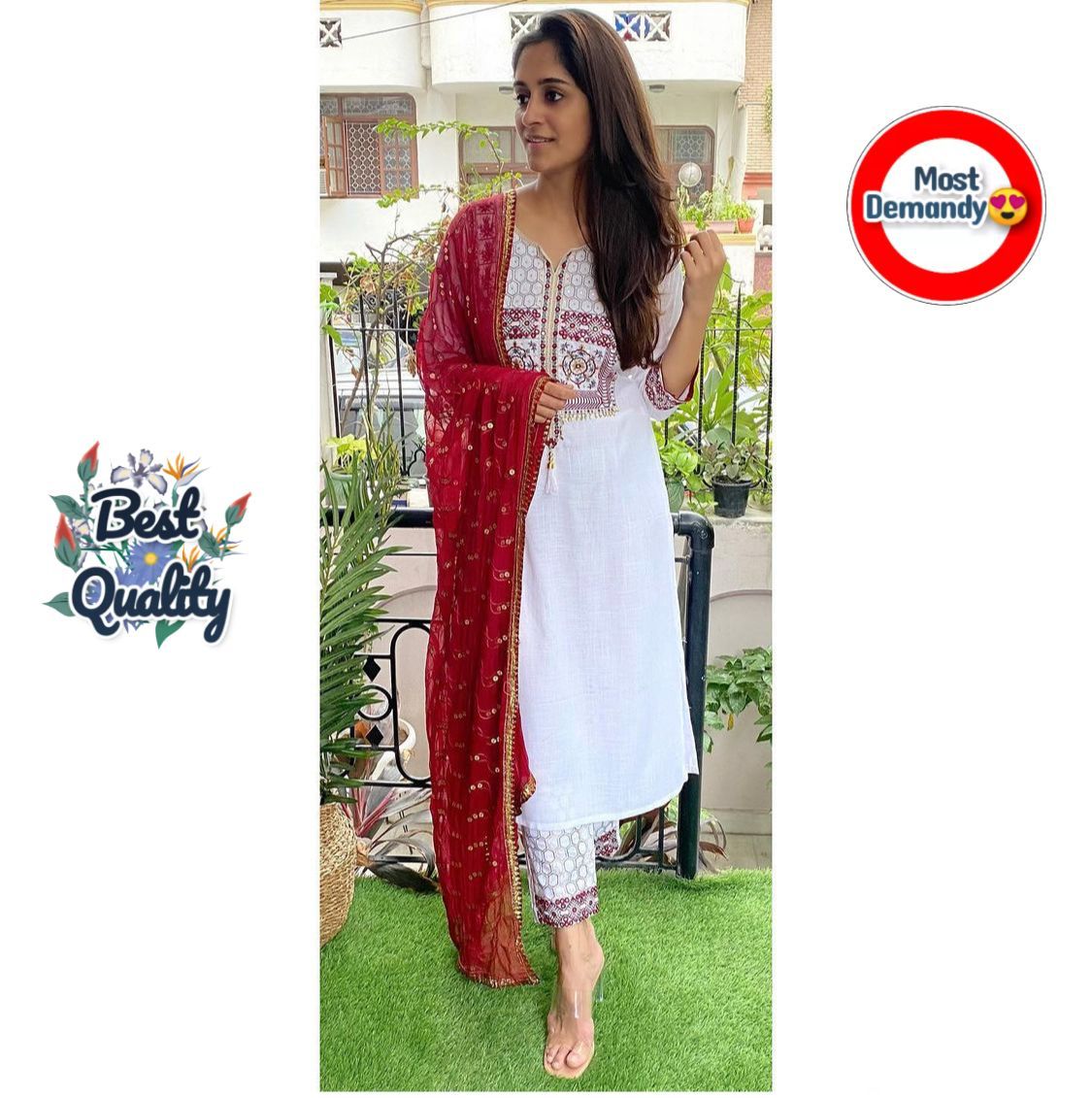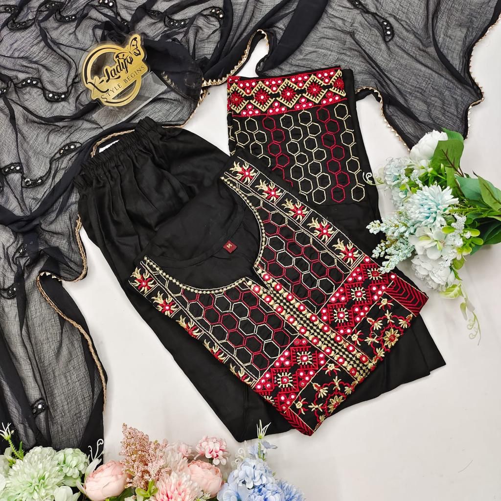 Premium Rayon cotton Top with beautiful embroidery on yoke & Rayon pant with beautiful embroidery with chiffon embroidery Dupatta …..