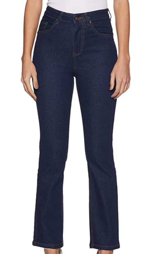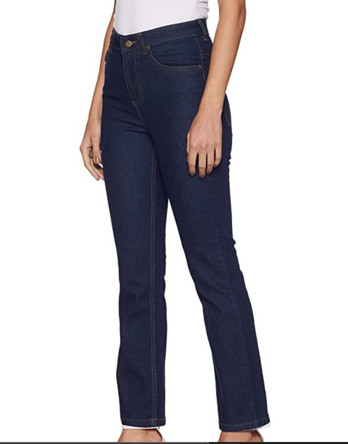 - Form flattering Jeans where the same width of cut is used below the knee as above the knee. Stretch fabric containing Spandex to help in fit and comfort